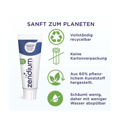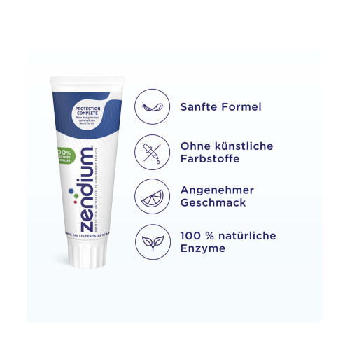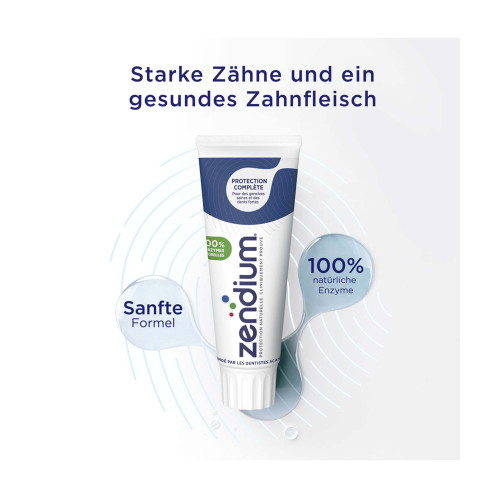 Zendium Complete Protection Zahnpasta bietet eine sanfte und gleichzeitig effektive Mundpflege, inspiriert von der natürlichen Abwehrkraft des Mundes. Die Formel enthält 100 % natürliche Enzyme und Proteine, die helfen, die Ursachen von Karies und Zahnfleischproblemen zu bekämpfen, und unterstützt so das Gleichgewicht des oralen Mikrobioms.
